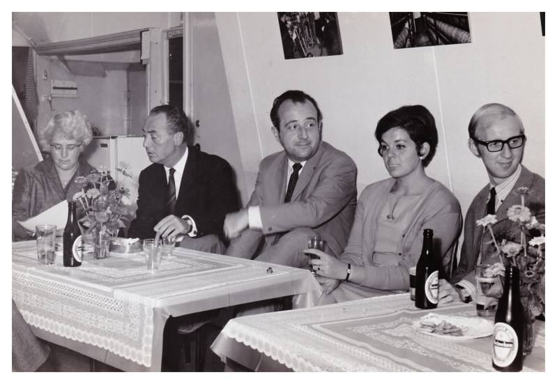 Wij zien v.l.n.r.: Ben van Hemert, Jan Blomsma, Herman Bresser (afgedekt door de heer Landré), Cor Halff, Otto Krooshof, Taede van Maanen, Jan Moonen, Wim Sips, .. . (Ik ben niet helemaal zeker van deze namen.)