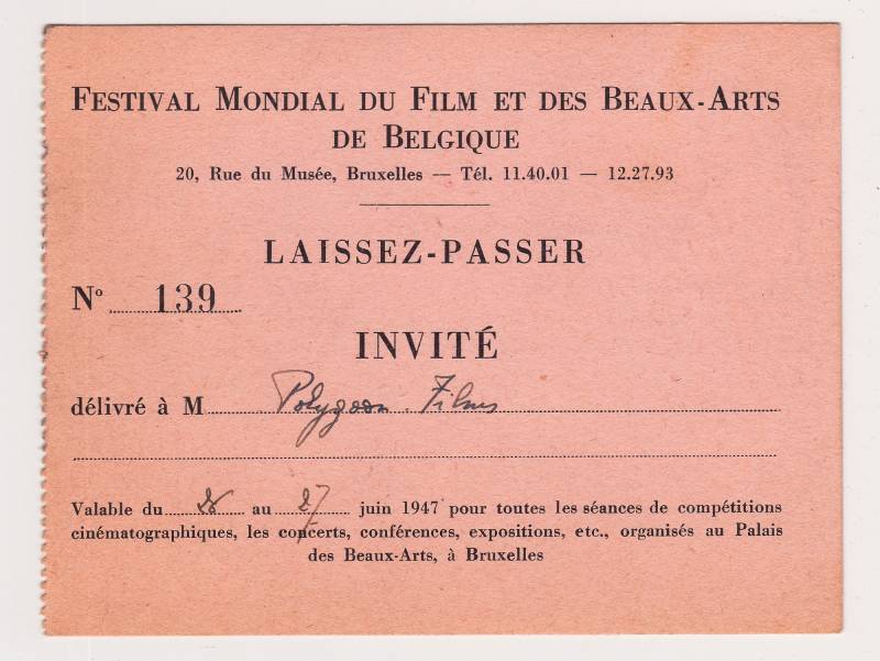 Een toegangsbewijs uit 1946 voor Polygoon. Blijkbaar werden er opnames gemaakt in De Harmonie in Leeuwarden.