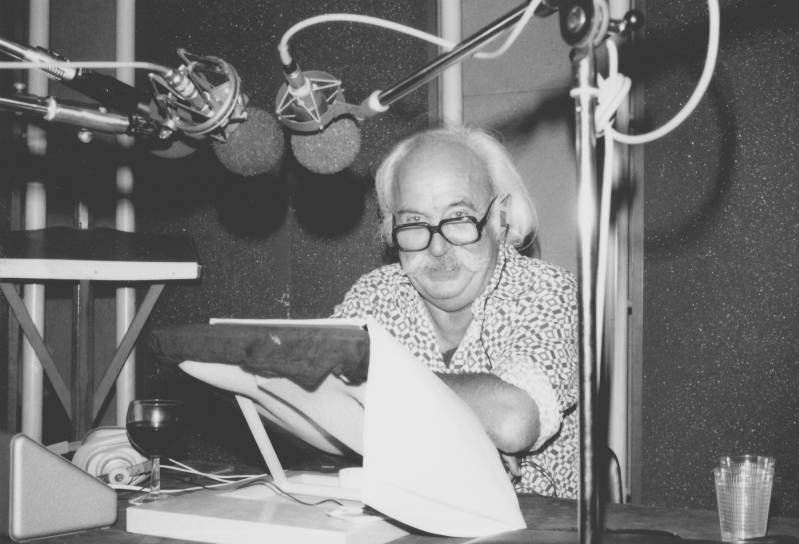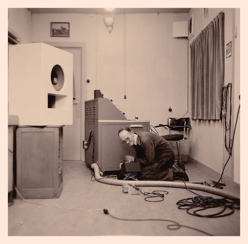 Frans Pulles bezig met een mixage. Muziek kwam meestal van grammofoonplaten, hier rechts van hem.