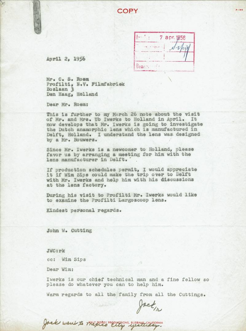 Eén van de belangrijkste tekenaars bij Disney was Ub Iwerks, zoon van een Duitse emigrant. In latere jaren werkte Iwerks aan speciale effecten voor Disneyfilms. Vandaar ook, dat hij in lenzen geïnteresseerd was, waaraan gerefereerd wordt in dit memo. De opnametechniek van 'Largoscoop' (zie memo) wordt op deze site nog apart genoemd.