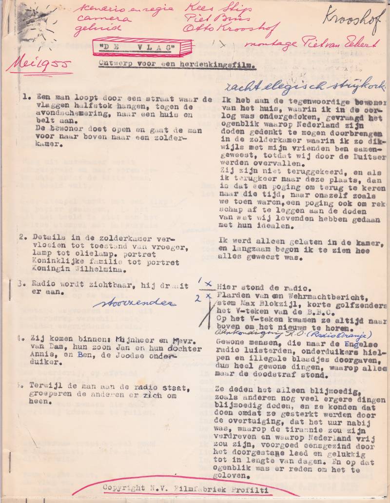 Tien jaar na het einde van de oorlog maakte Polygoon Profilti 'De Vlag'. Een film over wat de Nederlandse vlag betekende in de oorlog en hoe wij op 4 mei de doden herdenken door de vlag halfstok uit te steken. Regie was van Kees Stip, die ook het scenario schreef.